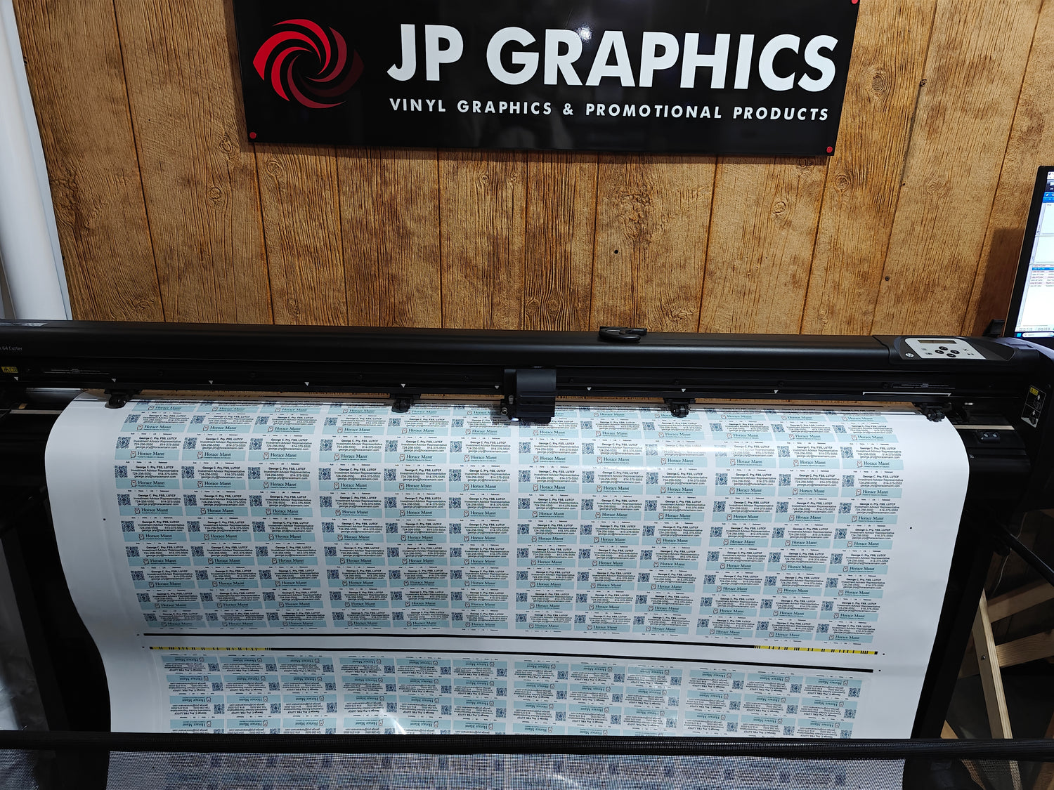 Once the order is printed, it is taken to our cutter, where it is then cut into individual stickers. Other products may be manually cut and finished with grommets or mounted onto another substrate to create a finished product.